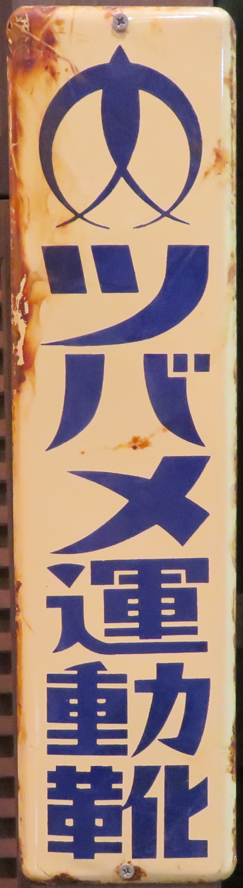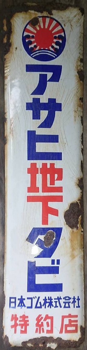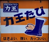 「アサヒ地下タビ・運動靴・ゴム靴」日本ゴム株式会社特約店 撮影地:兵庫県(展示品) 福岡県久留米市のアサヒコーポレーションさんの看板です。同社は明治25(1892)年創業、「志まやたび」を販売していました。大正3(1914)年「波にアサヒ」の商標登録。大正7(1918)年に「日本足袋」として会社設立。昭和12(1937)年に「日本ゴム」と改称しました。 |
