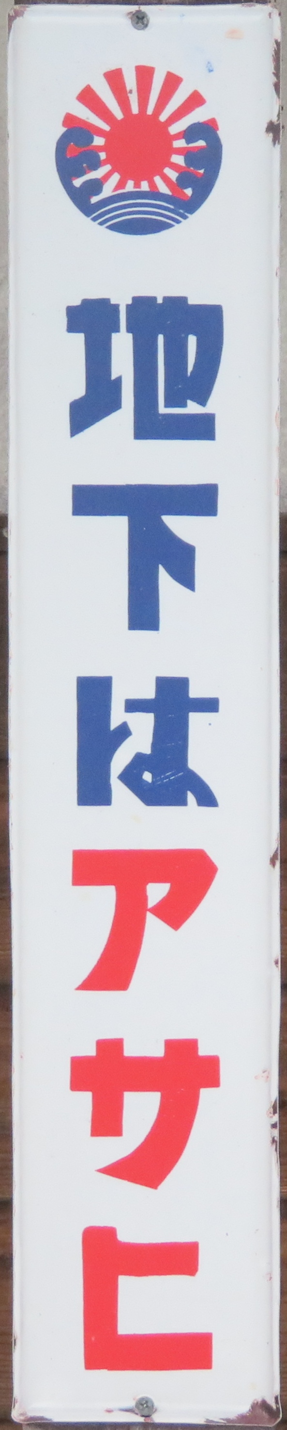 「アサヒ地下」 撮影地:北海道(展示品) 上の看板と比較すると「特許」の文字が無く、イラストの角度が違う別バージョン。 アサヒコーポレーションさんは昭和63(1988)年に現社名になりました。平成10(1998)年に会社更生法の適用を申請し倒産してしまいましたが、現在は再建されています。 |