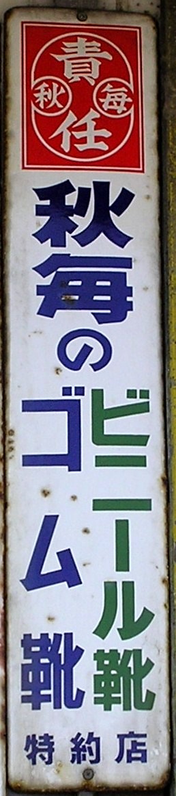 「秋毎のビニール靴・ゴム靴」特約店 撮影地:秋田県(展示品) 神戸市の秋毎さんの製品。同社は大正12(1923)年創業。昭和24(1949)年、秋毎護謨製造所として会社設立されました。 秋毎さんのページへ |
