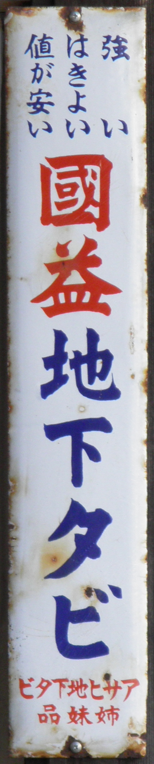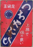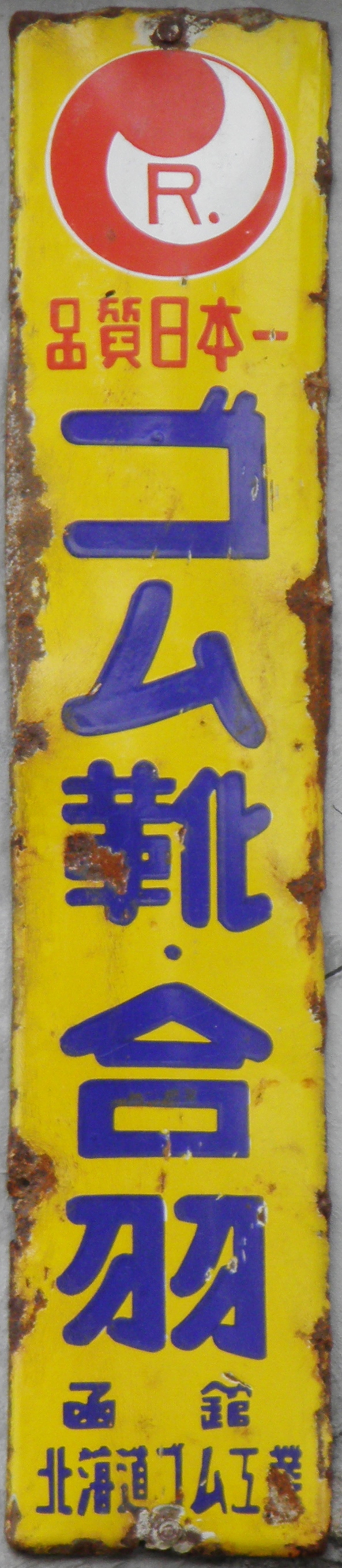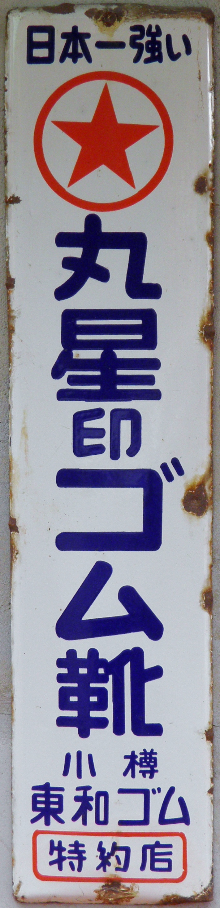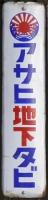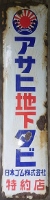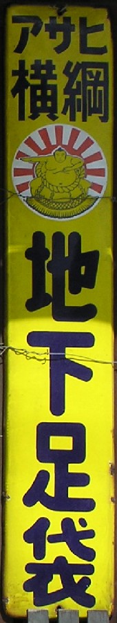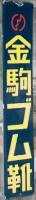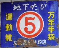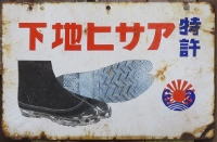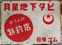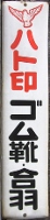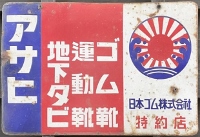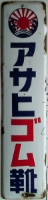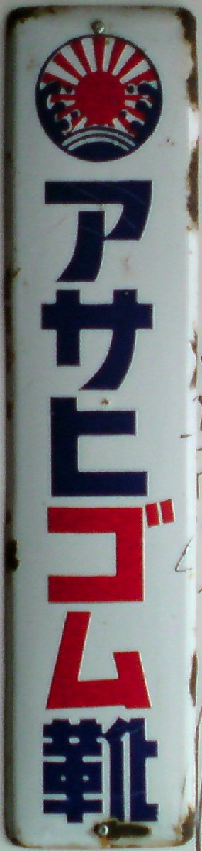「アサヒ地下タビ・運動靴・ゴム靴」日本ゴム株式会社特約店 撮影地:兵庫県(展示品) 福岡県久留米市のアサヒコーポレーションさんの看板です。同社は明治25(1892)年創業、「志まやたび」を販売していました。大正3(1914)年「波にアサヒ」の商標登録。大正7(1918)年に「日本足袋」として会社設立。昭和12(1937)年に「日本ゴム」と改称しました。 |