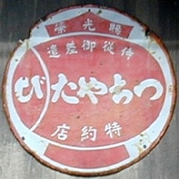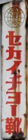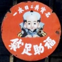 名實共ニ日本一「福助足袋」 撮影地:青森県(展示品) 福助さんのページへ福助さんは明治15(1882)年、大阪府堺市で足袋装束店「丸福」として創業。明治33(1900)年から福助の商標を使っています。大正8(1919)には「福助足袋株式会社」設立。昭和39(1964)年に「福助株式会社」となっています。この福助は昭和26(1951)年まで使われた図案のようです。同社は平成15(2003)年、民事再生法適用を申請。現在は別会社として事業を継続しています。 |
