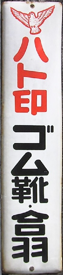 「ハト印ゴム靴・合羽」 撮影地:兵庫県 兵庫県明石市のシバタ工業さんの製品。同社は大正12(1923)年に神戸で創業。戦災により明石へ移転しました。現行商品にもハトのマークがついているものがあります。 シバタ工業さんのページへ |