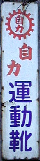 「自力運動靴」 撮影地:広島県 岡山市の日進ゴムさんのブランドだった模様。「自力」というネーミングが強烈です。「自力で走れ」ということでしょうか? 日進ゴムさんのページへ |