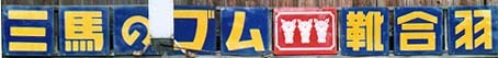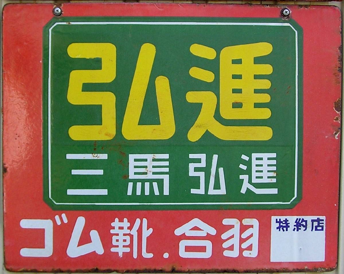 三馬弘進「弘進ゴム靴.合羽」特約店 撮影地:秋田県(展示品) 弘進ゴムさんのページへ仙台の弘進ゴムさんの看板です。昭和10(1935)年、弘進護謨工業として創業。昭和18(1943)年、三馬弘進護謨工業を設立し三馬護謨工業仙台工場と弘進護謨工業の事業を引き継ぎました。戦時中にゴムの原料が制限され、ミツウマさんの仙台工場と協力関係になったようです。昭和33(1958)年、「弘進ゴム」に社名変更。 |
