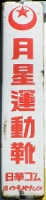 「月星運動靴」 撮影地:兵庫県(展示品) ムーンスターさんのページへおなじみ月星の運動靴です。社名が日華ゴムになっていますので昭和37(1962)年以前の看板になります。小さく「旧つちやたび」と書かれているところが興味深い一枚です。当時はまだ「月星」と言うより「つちやたび」のほうが通りが良かったのでしょうか。 |