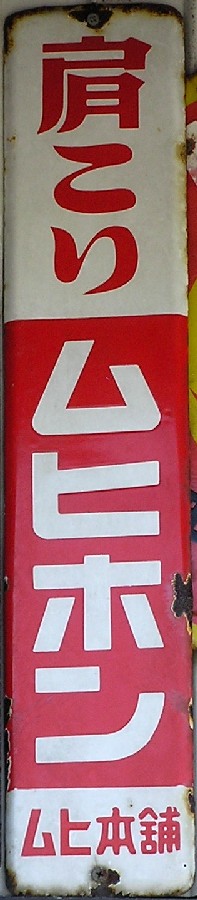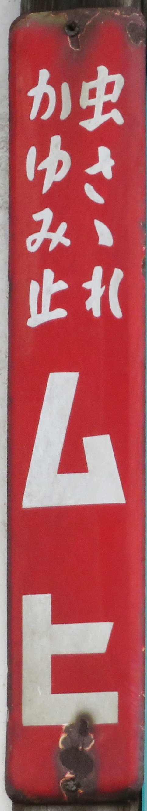 虫さされ・かゆみ止「ムヒ」 撮影地:滋賀県 (別バージョン) 撮影地:大阪府 手作りならではのわずかな字体の違いがマニア心をくすぐります。 肩こり「ムヒホン」ムヒ本舗 撮影地:秋田県(展示品) 頭痛「ノーヂ」ムヒ本舗 撮影地:青森県 富山県上市町の池田模範堂さんの製品です。明治42(1909)年創業。大正15(1926)年に「ムヒ」の製造を開始。 |