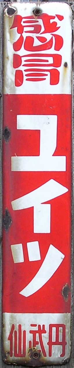 感冒「ユイツ」ムヒ本舗 撮影地:青森県 感冒「ユイツ」仙武丹 撮影地:山形県(展示品) 「ユイツ」は池田模範堂さんの風邪薬です。右の看板の下に書かれている「仙武丹」は山形県尾花沢市の配置薬業者・仙武丹さんを示していると思います。その社名は池田模範堂さんがかつて出していた仙武丹という薬にちなんでいるのではないかと推測しています。置き薬の世界はとてもややこしいのです。 |