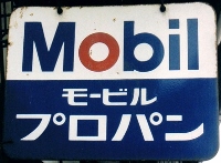 「モービルプロパン」 提供:春川淳さん 撮影地:滋賀県 上の「Mobiloil」は明治19(1886)年から明治39(1906)年頃に使われたマークの看板です。 まだ商標がペガサスではなくガーゴイルです。スタンダード石油が世界に進出したのも、ちょうどこの頃です。昭和41(1966)年頃から下の「モービル」ロゴが使用されています。(解説協力:星野信夫さん) | |