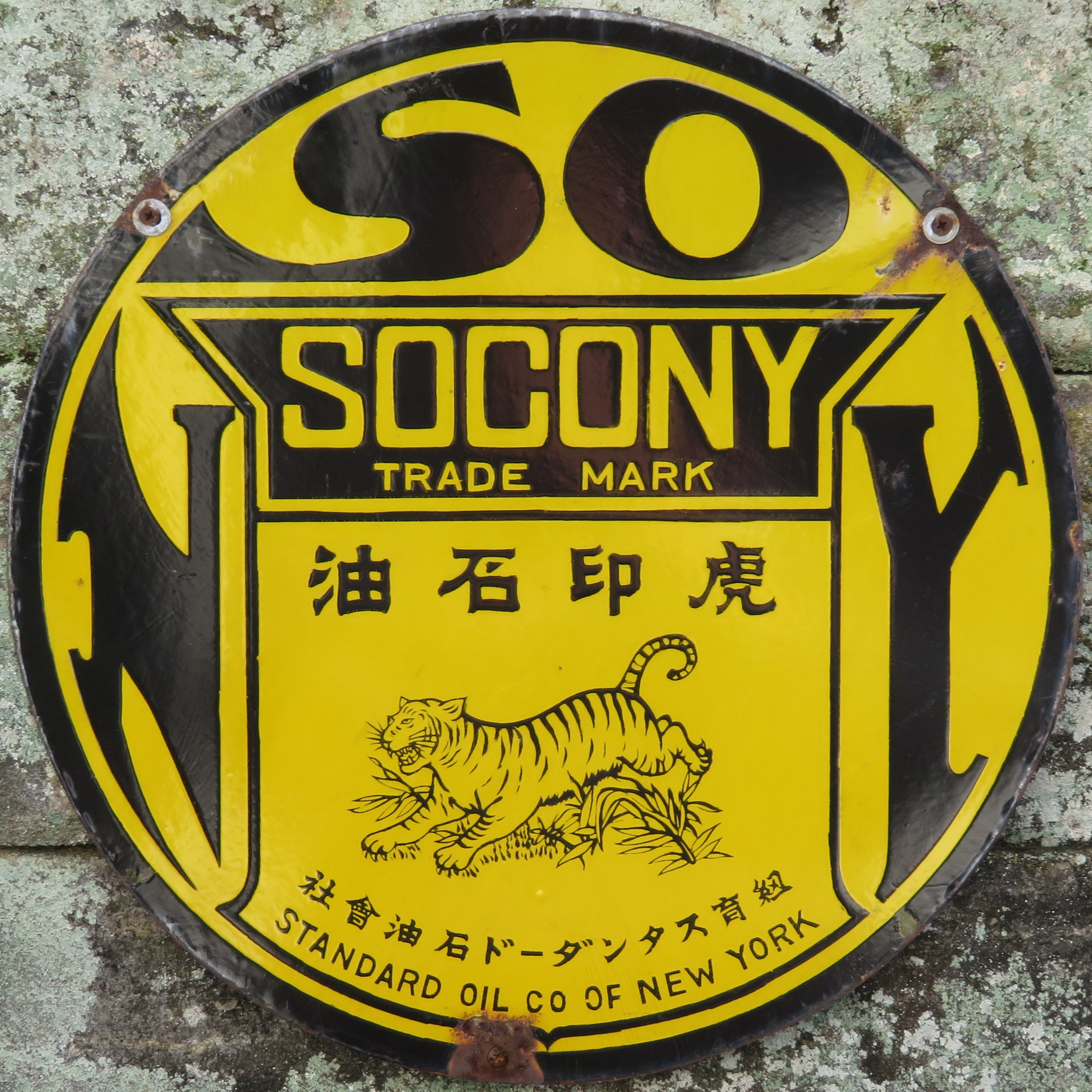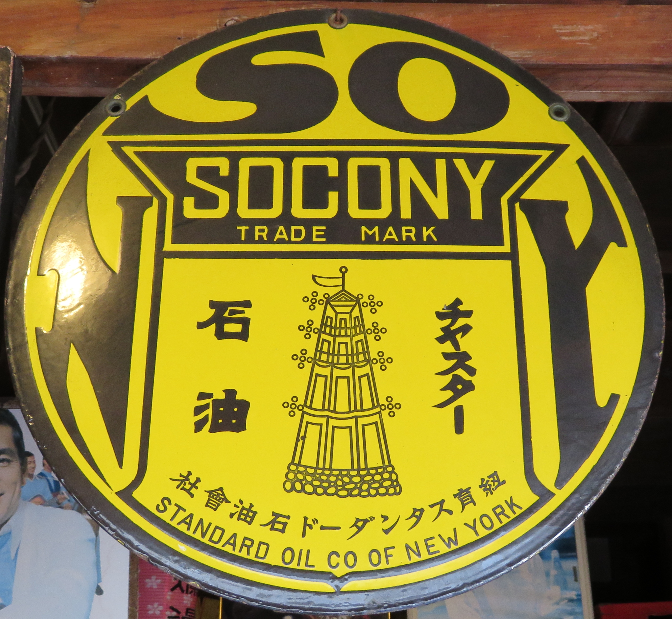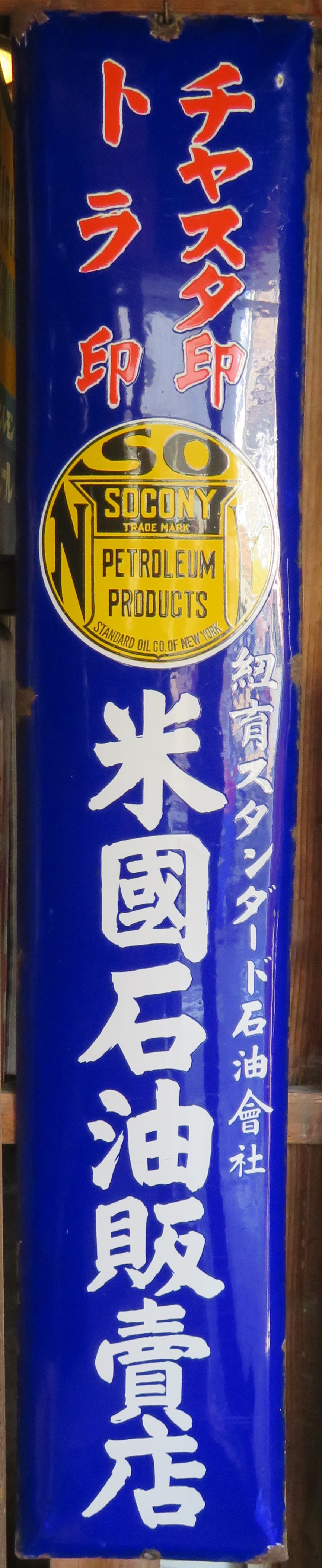 SOCONY「虎印石油」 SOCONY「チャスター石油」 チャスタ印・トラ印 紐育スタンダード石油会社「米國石油販賣店」 (3枚とも)撮影地:静岡県(展示品) 戦前既にアメリカの石油メジャーの販売網が日本にも根付いていたことを示す看板です。 |